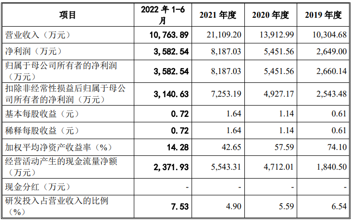 財務(wù)數(shù)據(jù):2019年-2022年1-6月,公司營業(yè)收入分別為1.03億元、1.39億元、2.11億元和1.08億元,凈利潤分別為2649.00萬元、5451.56萬元、8187.03萬元及3582.54萬元。