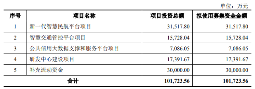 募資用途:此次IPO擬募資10.17億元,用于新一代智慧民航平臺項目、智慧交通管控平臺項目、公共信用大數(shù)據(jù)支撐和服務(wù)平臺項目、研發(fā)中心建設(shè)項目、補充流動資金。發(fā)行人本次發(fā)行前總股本12,260萬股,擬向社會公眾發(fā)行不超過4,087萬股普通股,超過發(fā)行后總股本的25%。
