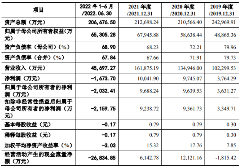 2019年至2022年1-6月,公司的營業(yè)收入分別為10.23億元、13.49億元、16.19億元、4.57億元;歸母凈利潤分別為3631.27萬元、9639.53萬元、9238.72萬元、-2159.75萬元。